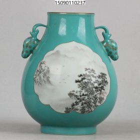 511_清中期 乾隆年制 苹果绿釉开窗墨彩山水纹葫芦瓶 全美品,器形少见,内底施松石绿釉,双龙耳描金,墨彩画工精细,宝光内敛,品相完好。
