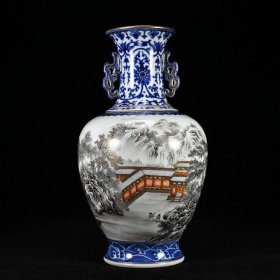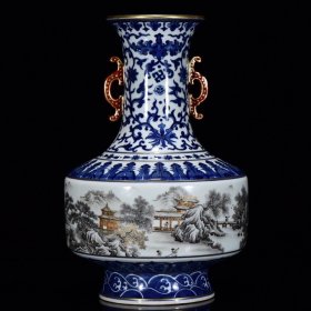 清乾隆青花描金墨彩山水楼阁纹双耳赏瓶规格35*20厘米