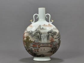 清乾隆年青花墨彩山水纹描金双耳扁肚瓶33*21