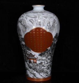清乾隆墨彩山水阁楼纹梅瓶,高39cm直径21cm