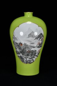 大清雍正年制 嫩芽绿釉鎏金双开窗墨彩山水纹梅瓶 高35厘米 直径22厘米