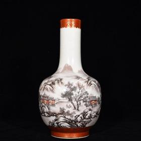 清乾隆墨彩矾红描金山水楼阁纹梅瓶