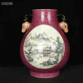 大清乾隆年制玫瑰紫釉墨彩开窗山水纹梅瓶 高:32厘米 宽:20厘米