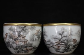 ,瓷器,描金墨彩人物山水亭台楼阁纹杯一对 宽8.3厘米高6.2厘米 编号6900k7175532,,,