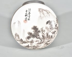 建国初期汪小亭写于平山草堂粉彩墨彩山水纹粉盒印泥盒 高4径7.9厘米1
