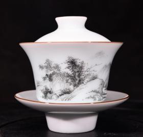 大清雍正粉彩墨彩山水纹天地人三才盖碗茶盏茶杯高9.5径9.5厘米