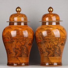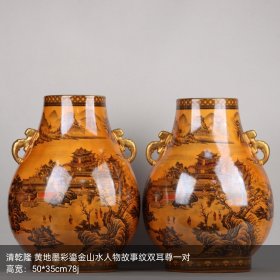 清乾隆黄地墨彩鎏金山水人物故事纹双耳尊一对 50*35厘米