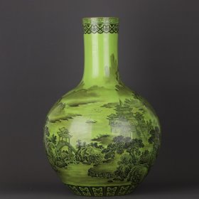清乾隆 绿釉墨彩山水楼阁纹天球瓶