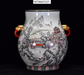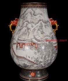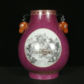 老瓷器 大清雍正胭脂红爬花开窗墨彩山水纹双耳瓶