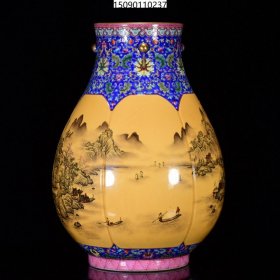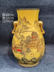 清乾隆 黄地墨彩鎏金山水人物故事纹双耳尊50*35