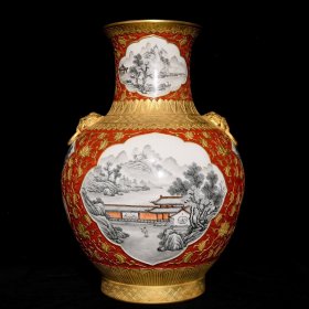 清乾隆浮雕鎏金墨彩山水纹兽耳瓶,46.5×34,价格:6750