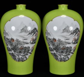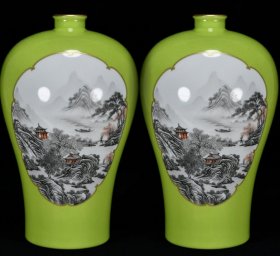 嫩芽绿釉鎏金双开窗墨彩山水人物纹梅瓶一对 高35厘米 直径22厘米