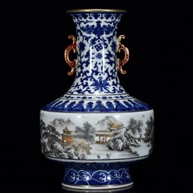 大清乾隆年制青花墨彩描金山水人物纹双耳瓶 尺寸33*21cm