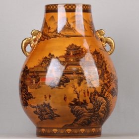 浮雕鎏金墨彩山水纹兽耳瓶,46.5×34