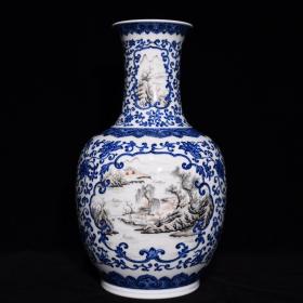 乾隆青花开窗墨彩山水人物纹瓶,高39.5直径23