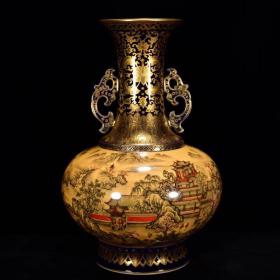 乾隆官窑黄釉墨彩本金山水人物故事纹双耳尊