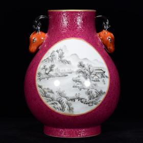 清雍正胭脂红扒花开窗墨彩山水纹双耳瓶