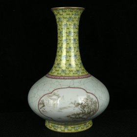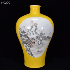 清乾隆年柠檬黄釉墨彩山水纹梅瓶