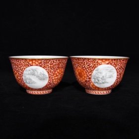 清雍正矾红墨彩山水纹杯,5.7×9.2,