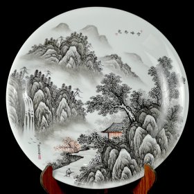 清雍正御制郎世宁墨彩山水纹大盘。高8.5*51。D