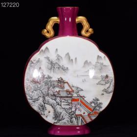 清乾隆年胭脂红墨彩山水纹鎏金扁瓶