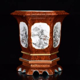 清乾隆御制木纹釉墨彩山水纹花盆25*22m