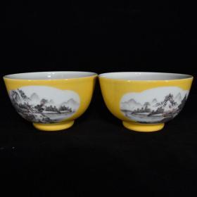 清雍正黄釉墨彩山水纹碗,7×12.2,