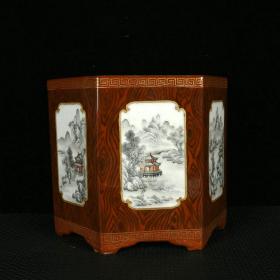 清乾隆木纹秞描金开光墨彩山水纹六方笔筒
