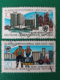 德国邮票 东德1982年工人联欢节-建筑 穿民族服饰的夫妇 2全销