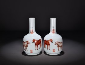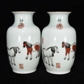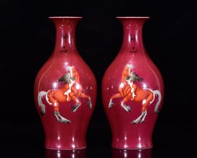 大清乾隆年制 郎世宁恭绘 珐琅彩骏马图赏瓶 对价 高24厘米 直径13厘米.