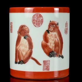 清乾隆郎世宁珐琅彩猿猴笔筒。高14.8*13