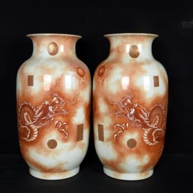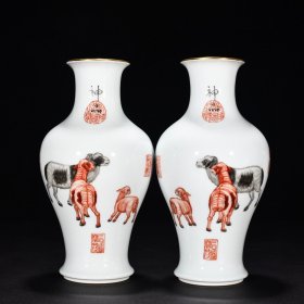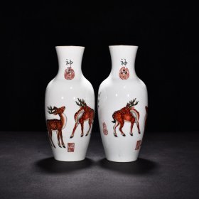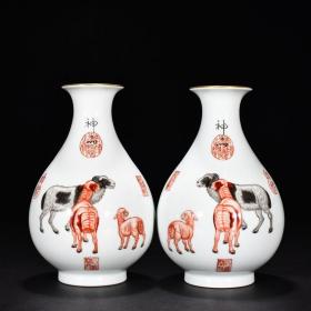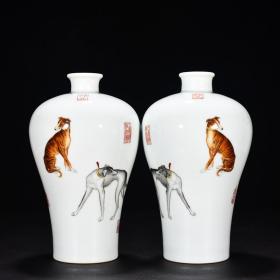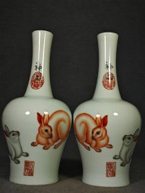 大清乾隆年制高档郎世宁珐琅彩兔子橄榄瓶一对。lxl