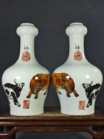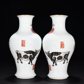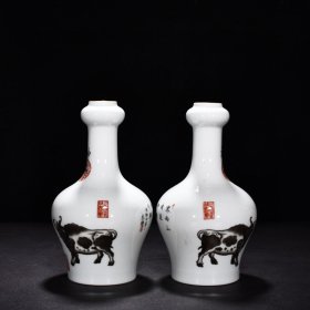 大清乾隆年制高档郎世宁牧牛图蒜头瓶一对。