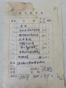 著名书法家,中国书法家协会主席沈鹏(曾任人民美术出版社编辑室副主任、总编室主任、副总编辑)签批《样书领用单》,“送出版工作者协会秘书处”,有“邓”签字,应为邓•力群?书名《延安剪纸》《潘天寿书画集》《南斯拉夫现代雕塑选》《西欧五十艺术大师传略》《欧洲现代画派论选》等!