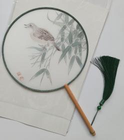 手绘团扇花鸟工笔画<竹鸟>