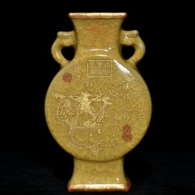 宋官瓷冰裂纹包口鎏金刻龙纹扁瓶