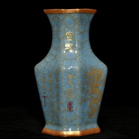 宋官瓷冰裂纹包口鎏金刻龙纹连体瓶