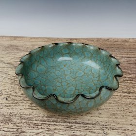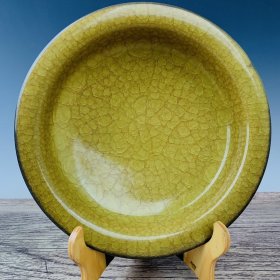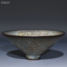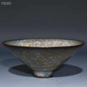 尺寸8*25.5 收藏品!宋官窑官瓷冰裂纹刻字描金斗笠型赏碗摆件:该器型规整、皮壳陈旧,底部刻字!品相完美。老味十足,自然磨损,是一件不可多得的艺术珍品,值得你拥有,尺寸8x25.5厘米,¥458