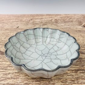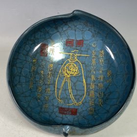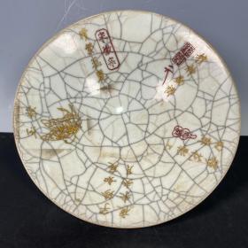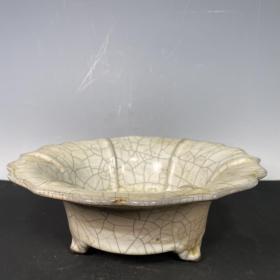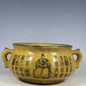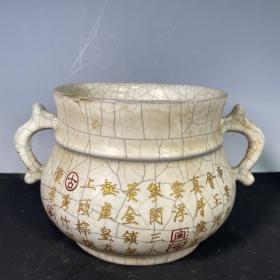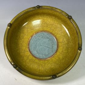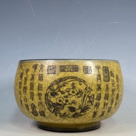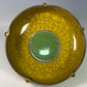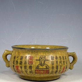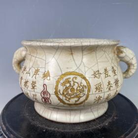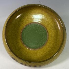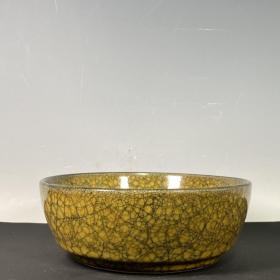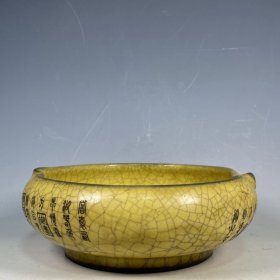 收藏品!宋官窑官瓷象牙黄冰花刻字描金《盆满钵满》金钵摆件:该器型规整、皮壳老辣、品相完美。老味十足,自然磨损,值得你拥有,尺寸12.5x21厘米
