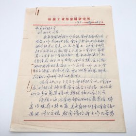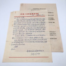 冶金工业部金属研究所,1973年致时任中国科技大学教授、著名热力学家刘叔仪,关于筹办刊物《金属》并将召开部科技会议讨论创刊试编方案,向其征求意见函件一份两页(使用“冶金工业部金属研究所”笺纸书写。刘叔仪旧藏)