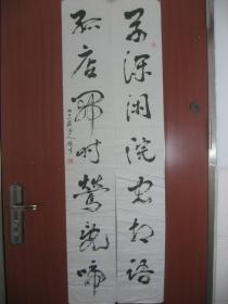 【8—640】 临摹仿制中国著名书画艺术大师黎雄才的字体书写对联(萬深闲院…)长22cmx宽137cm X2 保证手工书写 画边撕裂破损 品相如图(未裱)