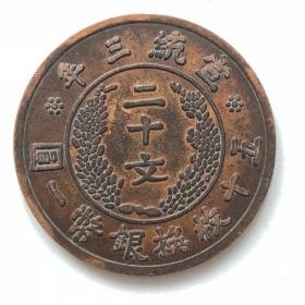 宣统三年大清铜币二十文铜板铜元钱币铜圆