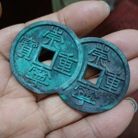 古玩珍藏北宋古钱币崇宁重宝稀有连体钱红斑绿绣包浆老铜板铜钱。重量是13克,长度6.5厘米,宽度3.9厘米,