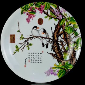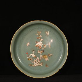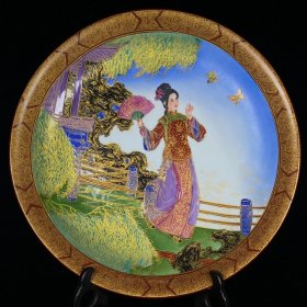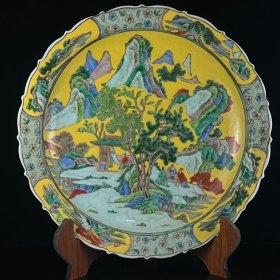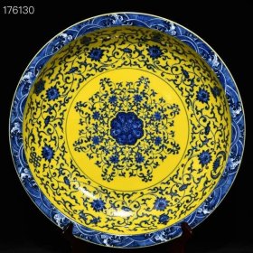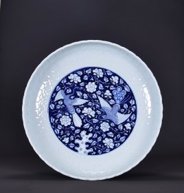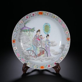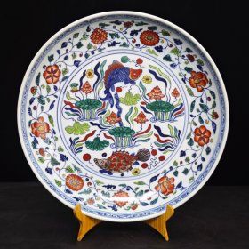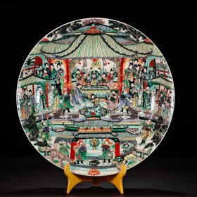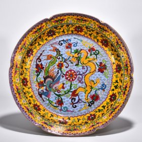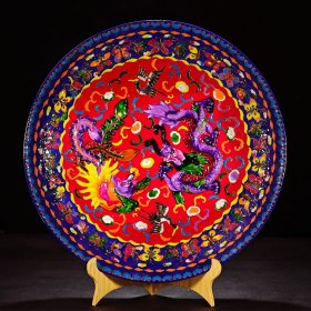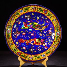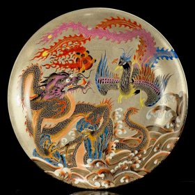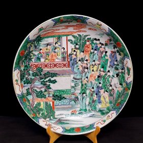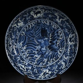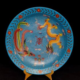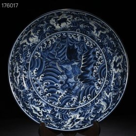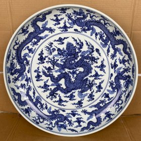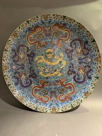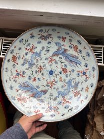 【铁牍精舍】【瓷器佳品】【瓷27】清嘉靖款青花加彩大盘,盘内饰青花双龙双凤,并云蝠纹,加彩饰杂宝纹,青花双边,盘沿描金,盘侧纹饰相同,底款楷书“嘉靖年制”,直径39cm,高7cm