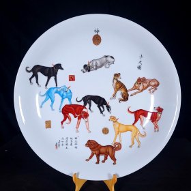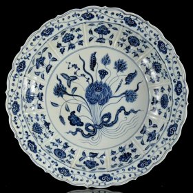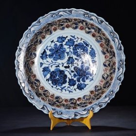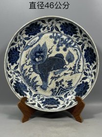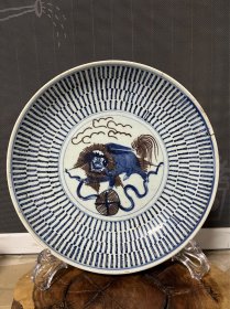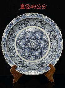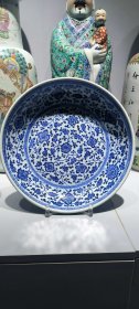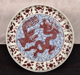 雍乾时期青花釉里红狮子绣球寿字纹大盘,器形硕大,厚胎深腹,发色釉水一流,口沿一道窑裂带线,一道后天老短线,另有小飞皮和剥釉,难得传世品,问题不大,值得收藏拥有。