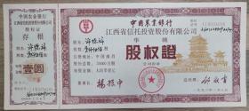 中国农业银行江西省信托投资股份公司股权证滕王阁图案八品推荐