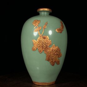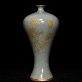 宋汝窑鎏金开窗花鸟纹梅瓶 高28.5厘米直径13厘米