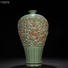 元龙泉梅子青釉贴塑折枝花鸟纹梅瓶 46*26厘米