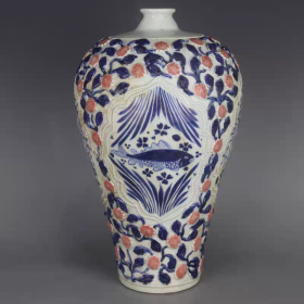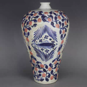 青花釉里红捏花花鸟纹梅瓶