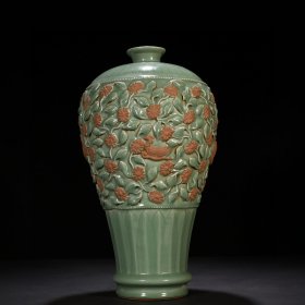 瓷器 元龙泉梅子青釉贴塑折枝花鸟纹梅瓶 46*26厘米